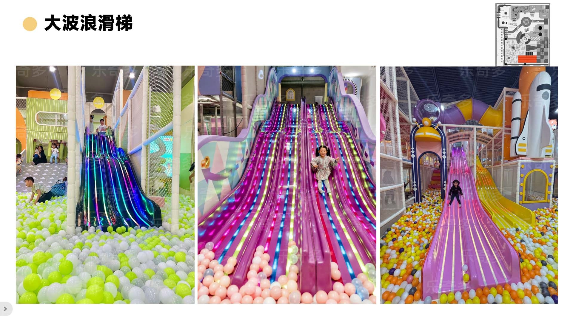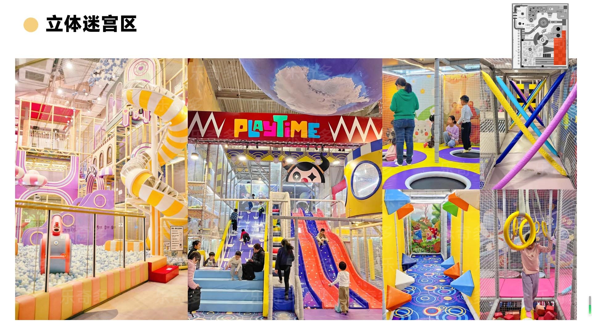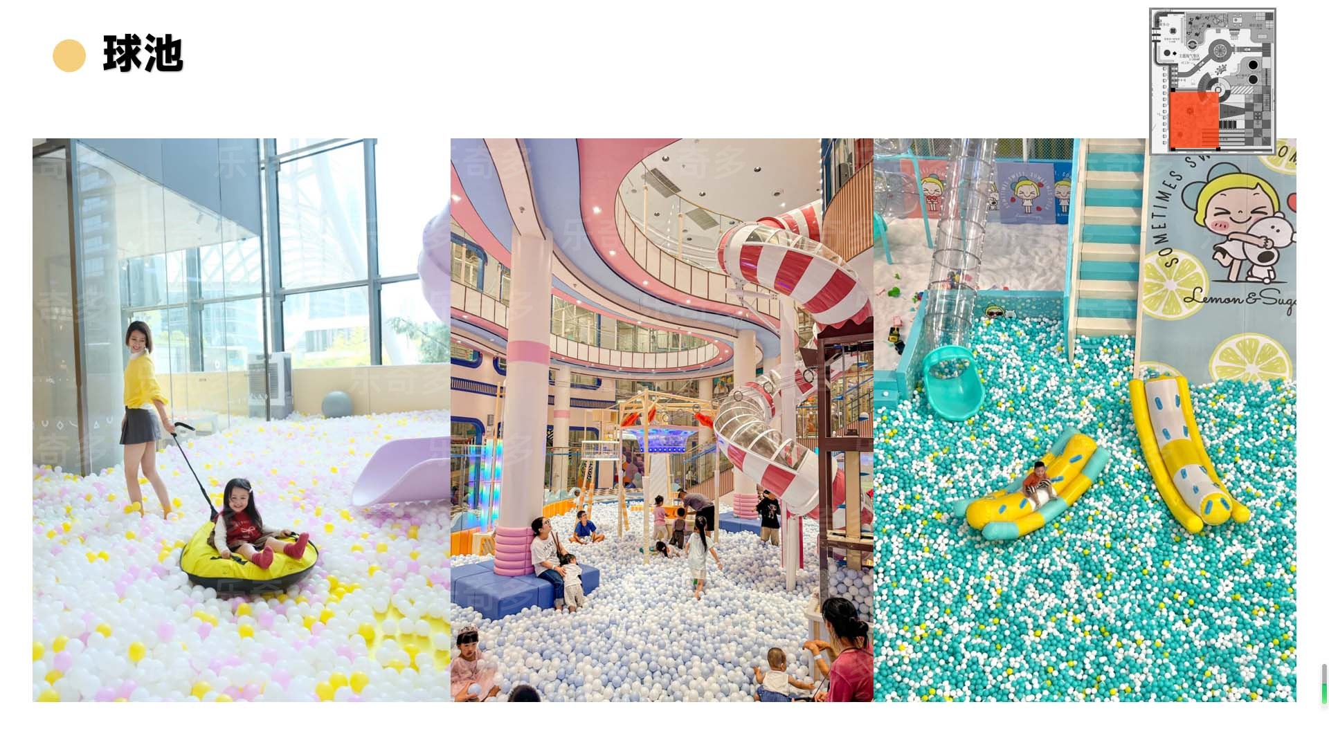 項目玩法:沙池探寶,海洋球池,波浪滑梯,互動投影,組合滑梯,手工區,彈跳迷宮、兒童小蹦床,角色扮演,公主屋,親子餐廳等。